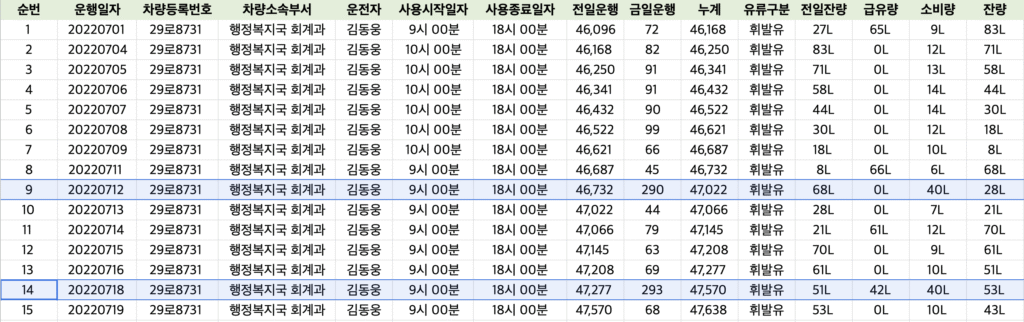 차량 반납하는 시간을 정확히 기록해야 합니다. 편의대로 작성하는 공문서는 오염된 문서로 견제와 감시 및 관리를 무력화합니다. 사소하지만 매우 중요한 문제입니다. 작성하는 차량운행일지가 사실과 다르다는 점은 얼마든지 기록을 허위로 만들어낼 수 있다는 것을 의미합니다. 공개된 내역이 지어낸 것이라면 사적으로 사용해도 알 수가 없게 됩니다.