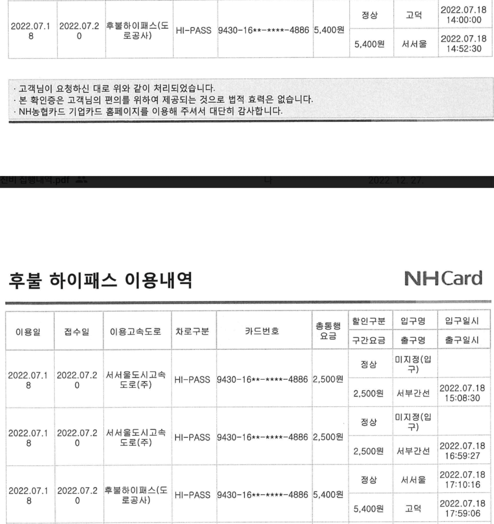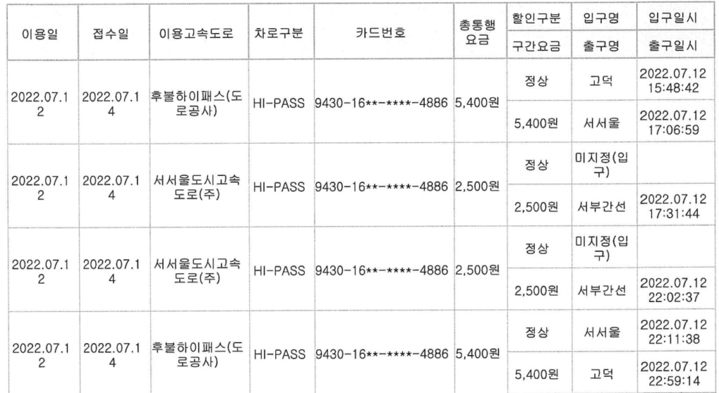 7월 12일 하이패스이용내역을 살펴보면 15:48 고덕 톨게이트를 지난 후 서울 서부간선 톨게이트를 17:31 진입합니다. 그리고 22:02 서부간선 톨게이트를 바져나와 고덕 톨게이트에 22:59 도착합니다.