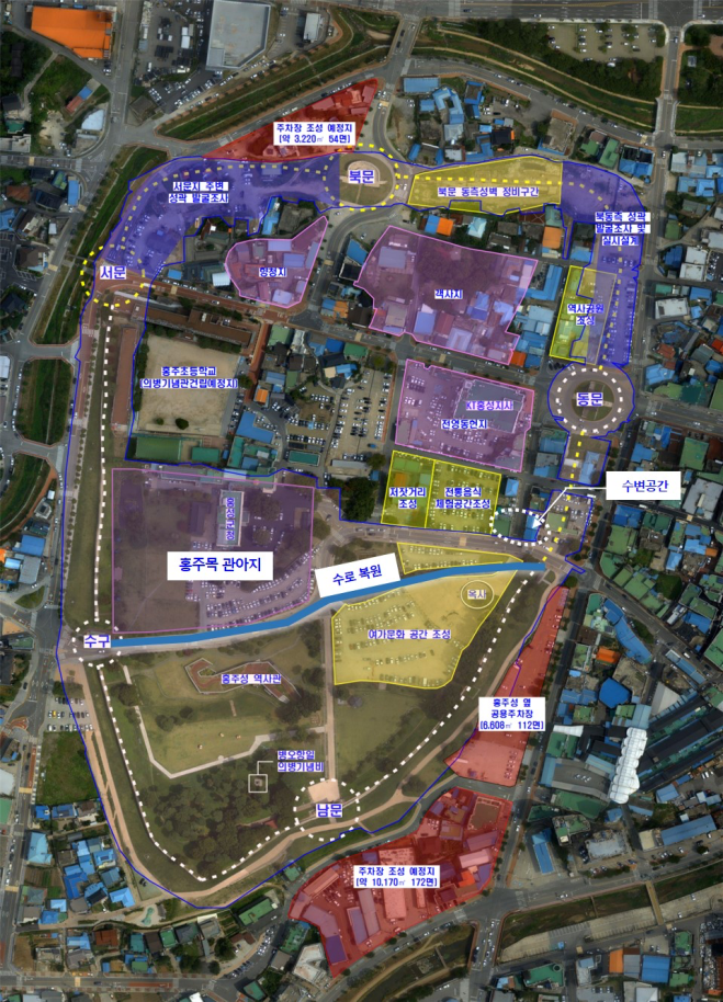 아래 두번 째 그림의 분홍색은 2021년 문화재 구역 추가 지정 조감도 입니다. 첫번째는 홍주읍성 복원계획 사업 예정지 조감도 입니다. 향청지, 객사지(현 예비군중대 위치), 전영동헌지(현 KT지사 위치), 수변공간, 전통음식체험공간은 문화재구역이 아닙니다.