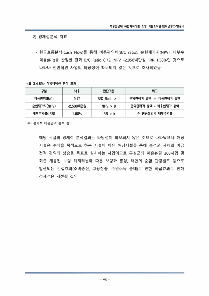 “해당 시설의 경제적 분석결과는 타당성이 확보되지 않은 것으로 나타났으나 해당 시설은 수익을 목적으로 하는 시설이 아닌 해당시설을 통해 홍성군 자체의 비금전적 편익의 상승을 목표로 설치하는 사업이므로 홍성군의 어촌뉴딜 300사업 및 최근 개통된 보령 해저터널에 따른 보령과 홍성, 태안의 순환 관광벨트 등으로 발생되는 간접효과(소비증진, 고용창출, 주민소득 증대)로 인한 파급효과로 인해 경제성은 개선될 것임” (사업타당성 검토 용역 95쪽, 2022.03 / 위에서 두번째 사진 참조)