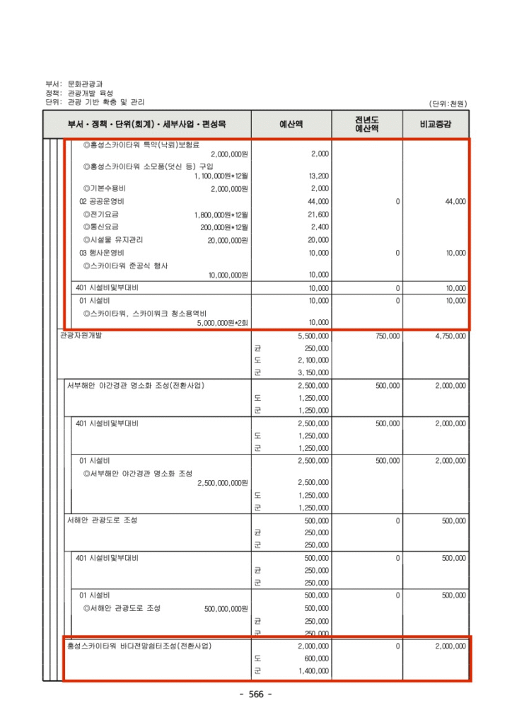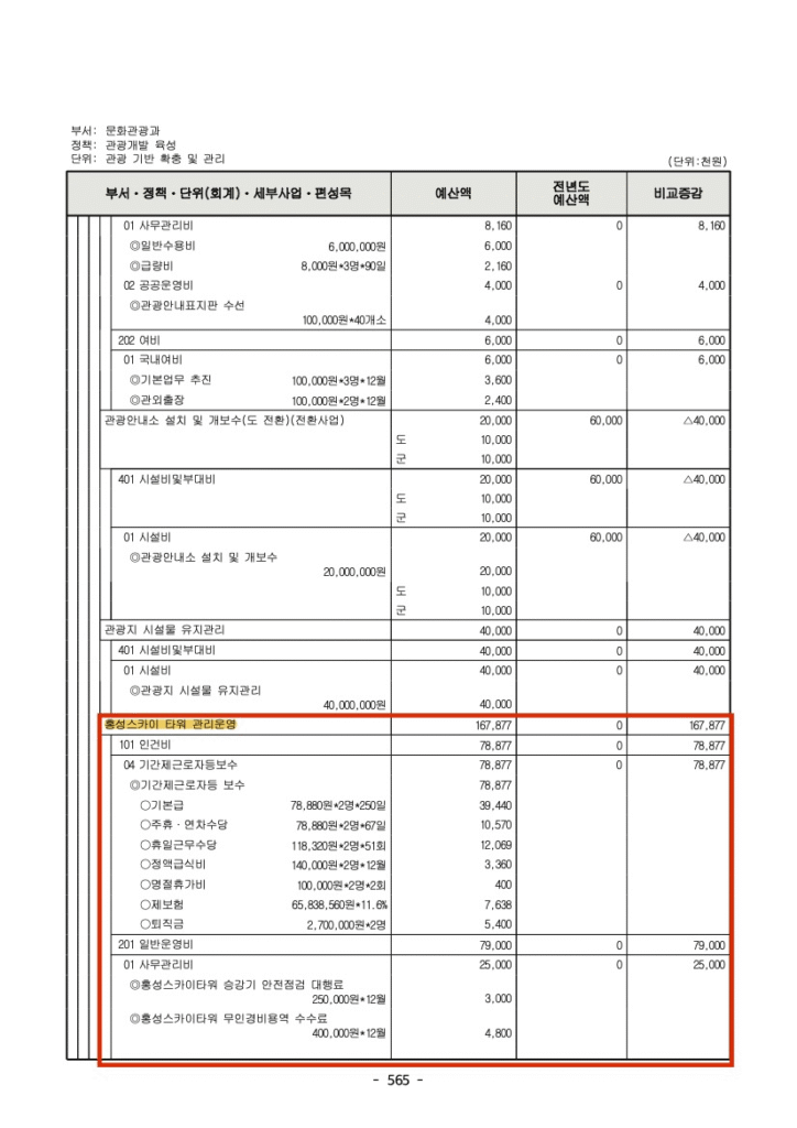 관광지 개발이 외부 인구의 유입을 꾀한다는 점에서, 이와 같은 예산편성은 홍성에 살지 않는 사람들의 여가와 즐거움에는 100억을 넘게 사용하고, 정작 홍성에 사는 군민들의 일상적 필요는 외면한 것 아닐까요? 이래저래 씁쓸한 예산 편성입니다.