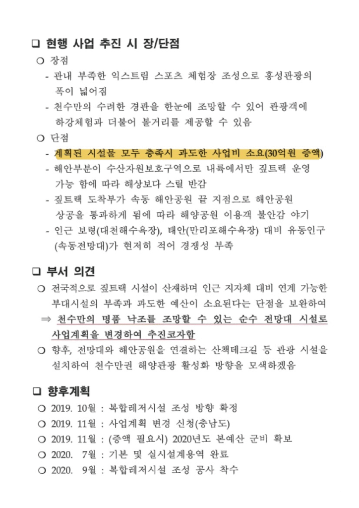 홍성군 내부 문서에 따르면, 원래 계획을 취소한 이유로 짚라인을 포함한 계획 시설을 모두 추진할 경우 30억원 증액이 필요하다는 재정부담 문제를 들었습니다. 그런데 결과적으로 30억이 증액된 것입니다. 더 적은 시설물을 규모를 늘려 더 비싸게 지으면서 목표로 했던 과도한 사업비 소요를 방지하지 못한 것입니다. 사실상 비용은 적게 예측하고, 타당성이 없는 사업을, 감으로만 성과를 예상해서 무분별하게 추진한 꼴입니다. (아래 변경 전 계획, 2019 홍성군 내부자료 참고)