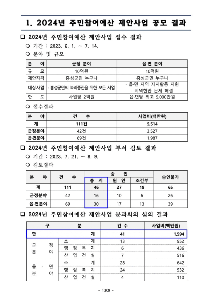 “어르신 행복 나눔 마실방 운영”, “어려운 가정집 고쳐주기 사업”, “홍동면 마을공동체 미디어 운영”, “음식물쓰레기 자원화를 위한 ‘음식물 건조 분쇄기’ 설치”, “구항면 마을별 소규모 영농폐기물 공동집하장 설치 사업”. 2024년 접수된 주민참여예산 사업에서 탈락된 읍면분야 사업의 제목입니다. 만약, 50억을 주민참여예산에 투입했다면 이번 심사에서 통과하지 못했으나 필요성이 높아보이는 사업을 추진할 수 있었을 것입니다.