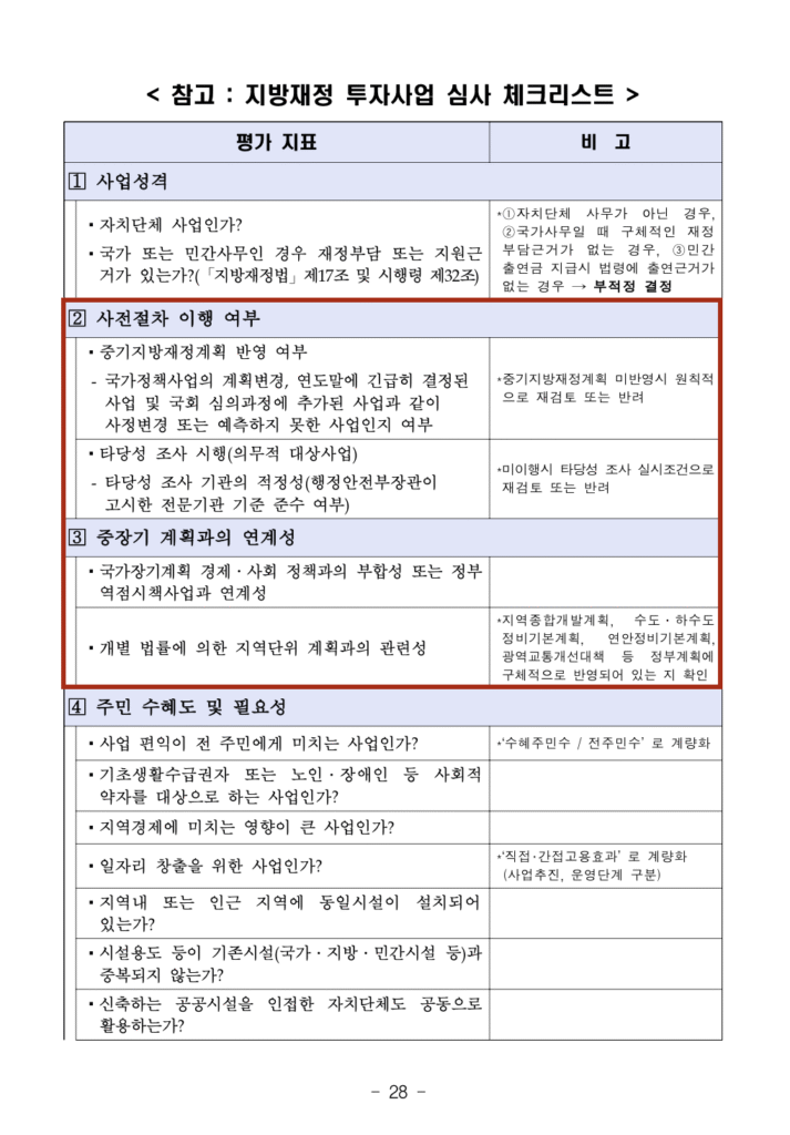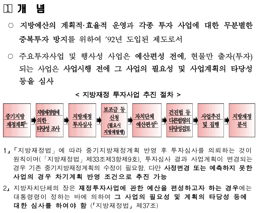 이번 호에서는 아래 그림 <지방재정 투자사업 추진 절차> 중 3 가지를 기억해야 합니다.