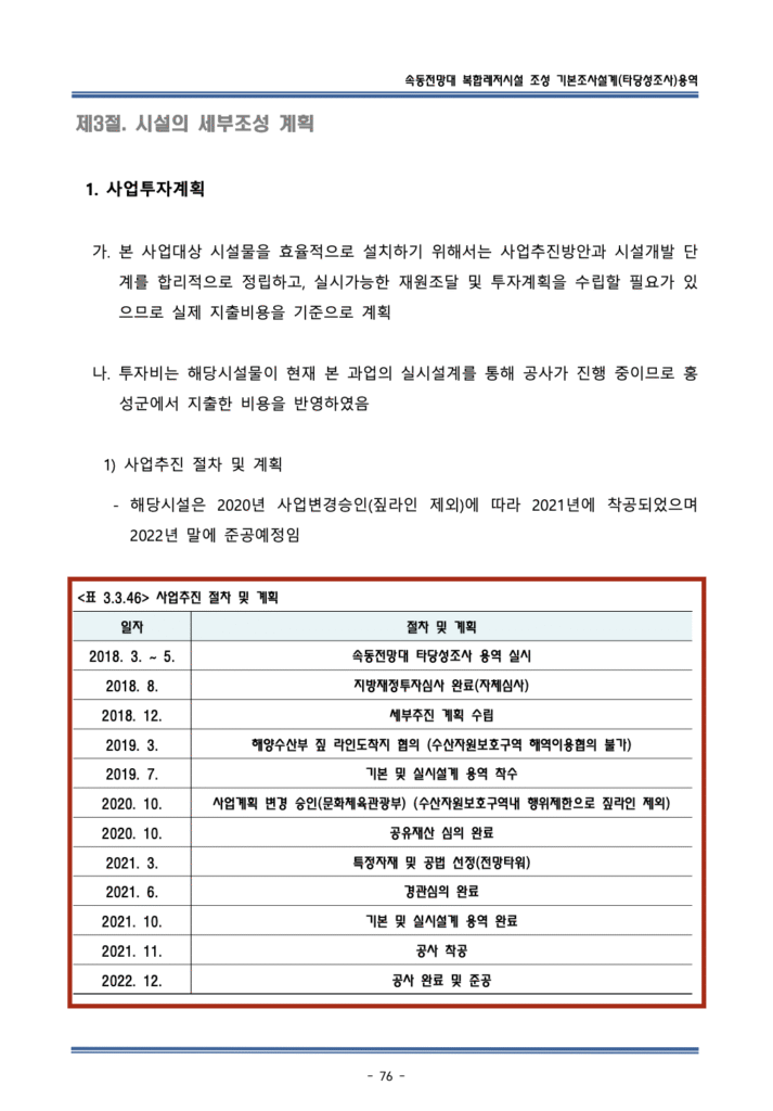속동 스카이 타워가 최초 짚라인이 포함된 사업인 점, 기억나시나요? 그런데, 짚라인 예정지는 수산자원보호구역으로 해당 구역에서는 짚라인을 설치할 수 없습니다. 그런데 2018년 5월 사전타당성 조사에서는 해당 내용에 대한 검토가 전혀 이뤄지지 않았습니다. 2019년 예산을 편성하고 나서야 홍성군은 부랴부랴 수산자원보호구역 해제 협의를 추진합니다. 수산자원보호구역 해제 권한이 있는 해양수산부와 협의가 불발되는 2019년 10월까지 보호구역 해제를 시도했던 것으로 보입니다. 이러는 사이 홍성군은 2019년 7월 스카이타워 설계 용역을 발주해 놓고 돌연 4개월 만에 12월 용역을 중지시킵니다.