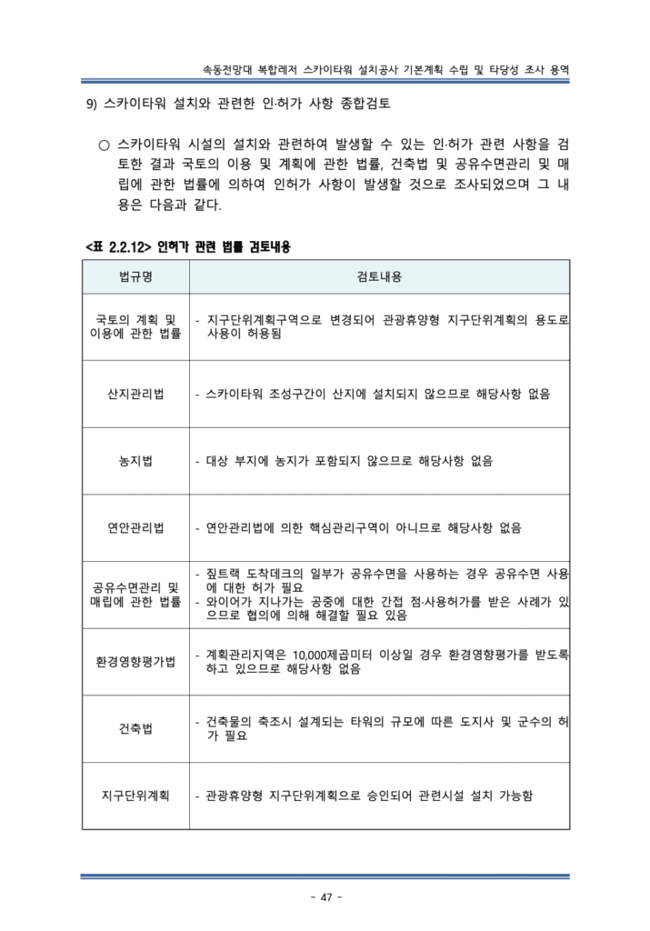 타당성 조사 과정에서는 추진하려고 하는 사업이 개별 법에서의 지구단위계획(공간계획)과 부합하는지 살펴야 합니다. 집을 지을 수 없도록 용도가 지정된 땅에 집을 짓겠다는 계획을 해서는 안 되는 것처럼 말입니다.