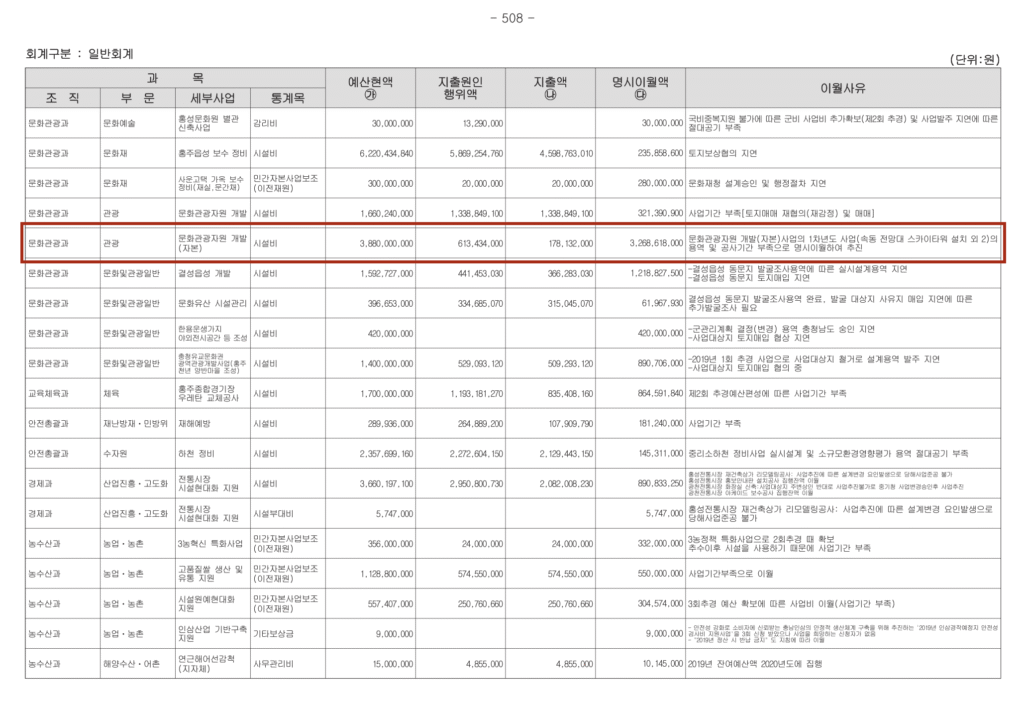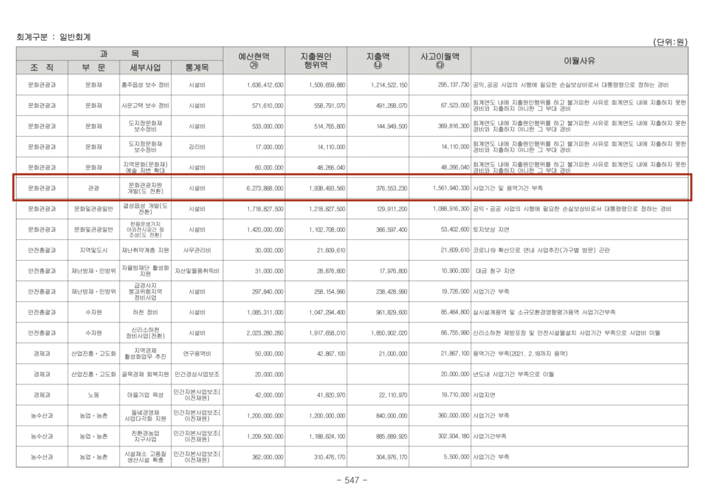 사고이월 사유도 문제 있습니다. 짚라인을 제외한 사업변경계획 승인은 2020년 10월입니다. 수산보호구역 해제가 불발된 것도 2019년 3월인데, 2019년 내내 보호구역 해제를 무리하게 시도하다가 2020년 10월 사업변경을 승인 받게 됩니다. 그런데 왜 이월 사유가 사업기간 및 용역기간 부족일까요? 지방재정법 50조 2항에서는 사고이월 사유를 규정하는데요, 사고이월은 사업 지출을 위한 지급결의가 된 후(실제로 지급하기 전)불가피한 경우에 가능합니다. 여기서 말하는 불가피한 경우는 재해나 자재의 지급 지연 등인데, 사고이월 사유가 이에 해당돼 보이지는 않습니다.