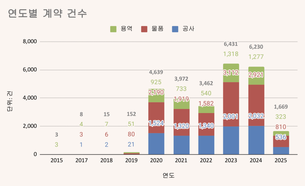 연도별 계약 건수를 살펴보면, 2022년까지 3,462건으로 줄어들던 계약 건수가 2022년 지방선거 후 현 군수가 본격적으로 일을 하던 2023년부터 6,431건으로 급증했습니다. 물품 계약 건 수 증가가 두드러지는데, 도로포장을 위한 아스콘 구매도 물품 계약으로 처리한 것이 확인됩니다. 즉, 전체 현황을 살펴보면 소규모 공사(배수로, 도로포장 등)가 증가했다는 점을 알 수 있습니다.