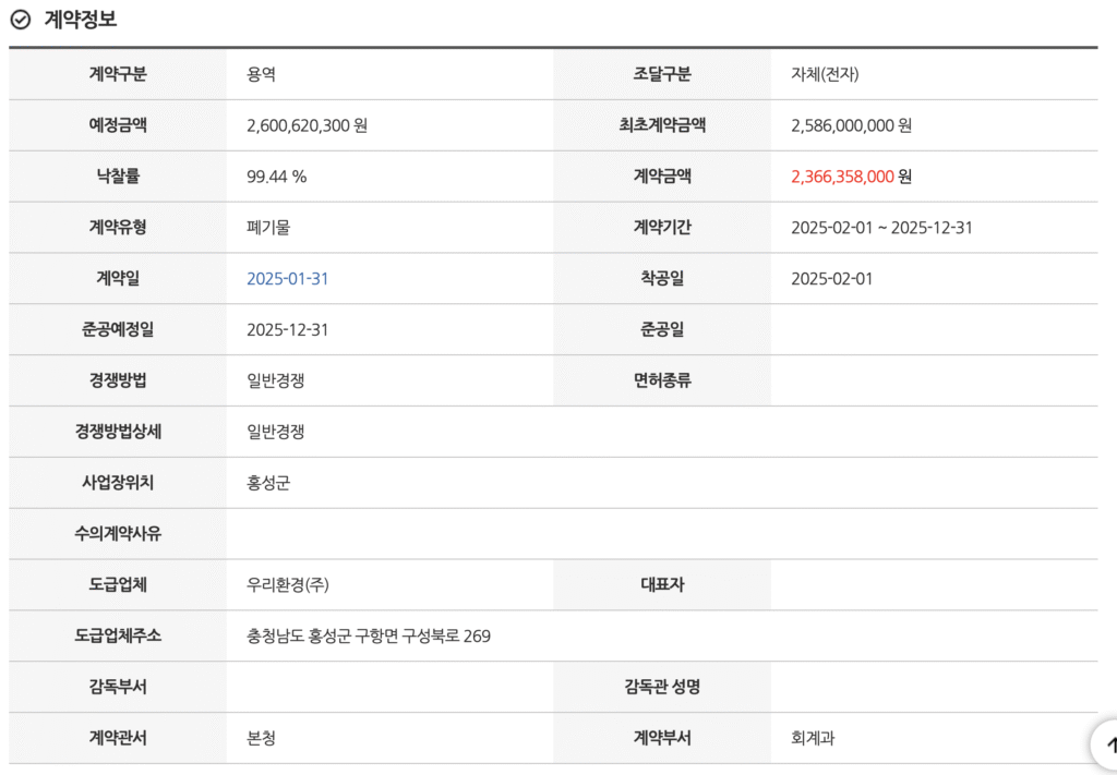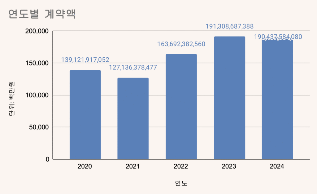 🙋‍♀️ 여기서 잠깐! | 월간홍시는 계약현황을 살피기 위해 홍성군이 공개하고 있는 그대로 사용했습니다. 또한 연도별 비교를 위해 정보가 상당 부분 누락된 2020년 이전과 아직 회계년도가 종료되지 않은 2025년 세부 분석에서 제외하였습니다. 월간홍시가 수집한 계약정보를 엑셀파일로 제공합니다. 맨 아래 [계약정보]를 클릭해 살펴보세요.