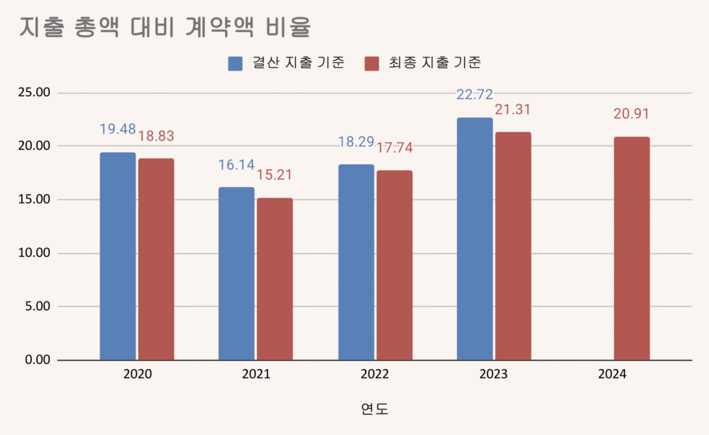 물론, 홍성군의 전체 예산이 증액되어 그 만큼 계약 건 수도 증액된 것 아닐까란 질문도 가능합니다. 그래서 전체 예산 대비(기금 제외) 계약 액의 비율을 살펴보니, 2020년 결산액 기준 19.4%가 계약으로 인한 지출이었습니다. 그런데 2023년은 결산액 기준 22.72%로 증가합니다. 아직 결산이 안 된 2024년 현황은 연도별 비교가 어려워, 회계년도말 예산 편성액인 최종 지출을 기준으로 살펴보면 총 지출 대비 계약 총액이 21%까지 증가했습니다.