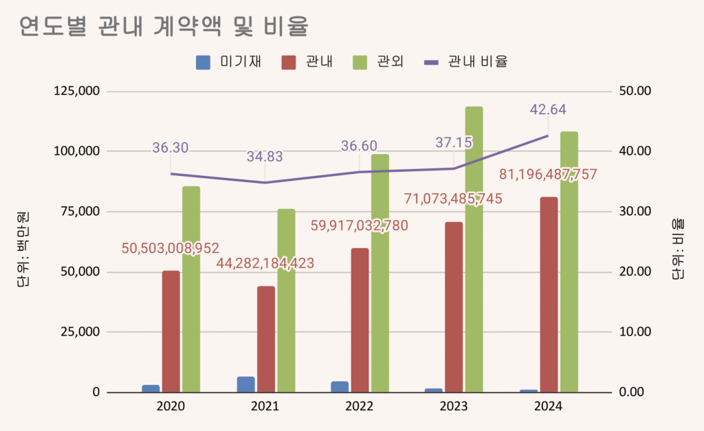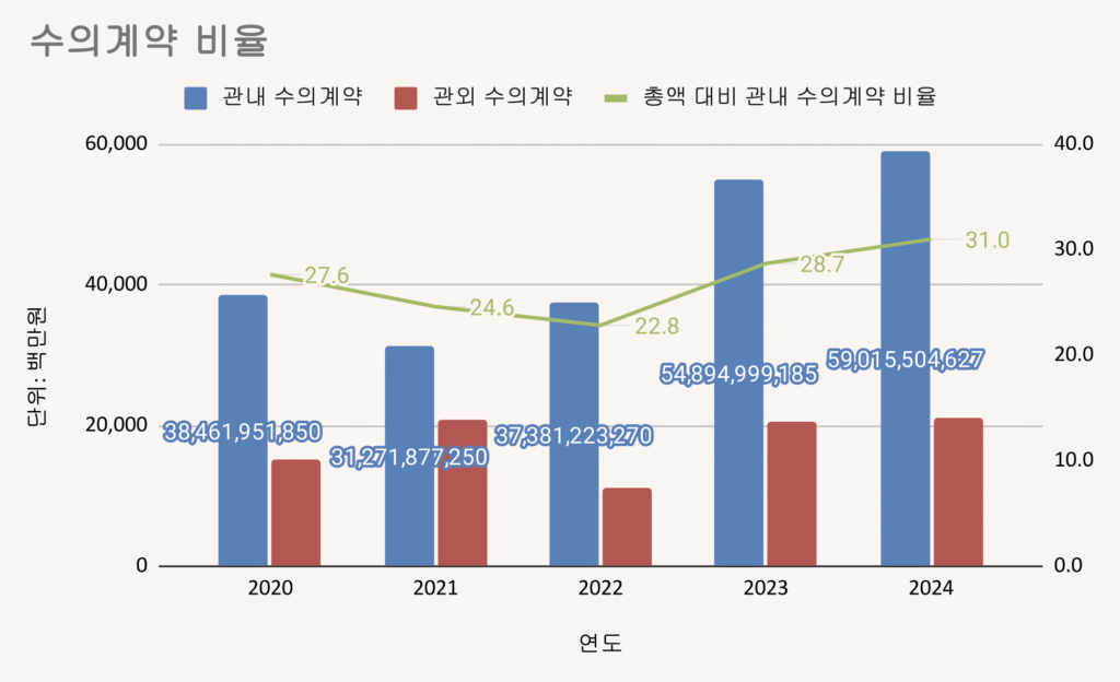 💡 어떤 업체에서 계약을 많은 했는지 궁금하다면, 아래 [계약정보]를 클릭한 후 하단의 [업체별 현황]을 클릭해보세요. 관내와 관외로 나누어 연도별로 현황을 확인할 수 있습니다. 첫번째 탭을 클릭하면 전체 현황도 살펴볼 수 있습니다.