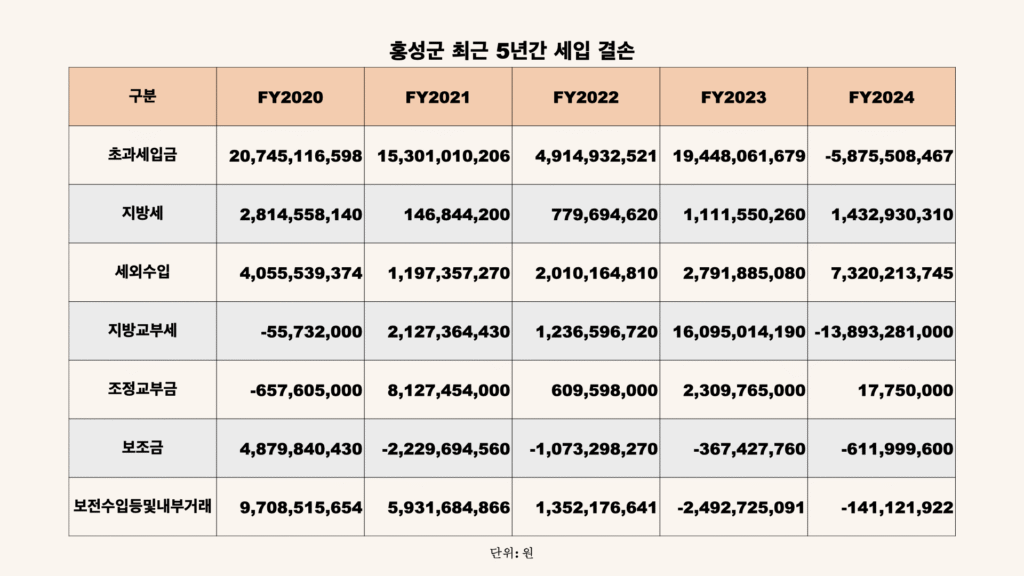 이런 현상은 매우 이례적인 상황입니다. 최근 5년 간 홍성군의 세입 결손을 살펴보면, 2024년도를 제외하고는 단 한 차례도 세입이 결손된 적이 없기 때문입니다. 가령, 2020년에는 초과 세입이 200억원에 달하기도 했습니다.