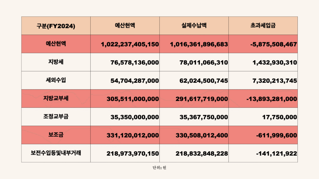 불길한 예감은 틀리지 않습니다. 2024년 홍성군이 예측한 세입은 약 1조원이었는데, 실제 들어온 세입은 약 58억원이 적자였습니다. 주민세 및 재산세 등으로 구성된 지방세는 예측보다 14억원을 더 많이 거두었고, 행정재산 임대료 및 사용료, 과태료 등으로 구성된 세외수입도 무려 73억원이나 더 많이 수납되었습니다. 그런데 문제는 국세 감소 여파로 홍성군의 자주재원인 지방교부세가 무려 138억원이나 적게 교부되었습니다.