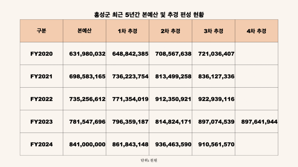 일반적으로 홍성군을 포함한 자치단체는 연 초에 본예산을 최대한 적게 편성하고, 연중 추경에서 그 해에 사용할 예산을 추가로 증액합니다. 그리고 마지막 추경에서는 한 해 사용한 예산을 실제에 맞게 예산서와 맞추는데요, 이를 정리 추경이라고도 합니다. 그런데 홍성군은 최근 5년 간 마지막 추경에서 직전 추경 대비 예산이 줄어든 적이 없는데, 2024년의 경우 약 250억원 규모의 감액 예산을 편성을 합니다.