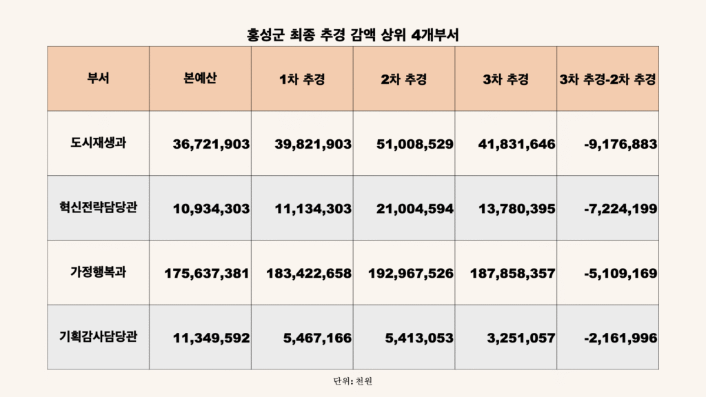 2024년 마지막 추가경정예산 심의에서 홍성군은 부랴부랴 여러 부서의 사업을 감액 편성했습니다. 본청 부서와 직속기관, 읍면사무소 총 38개 부서 중 30개 부서의 예산에 대해 감액 편성한 것입니다. 이렇게 한 해를 정리하는 마지막 추경에서 대규모로 예산이 감액되는 것은 매우 이례적입니다.