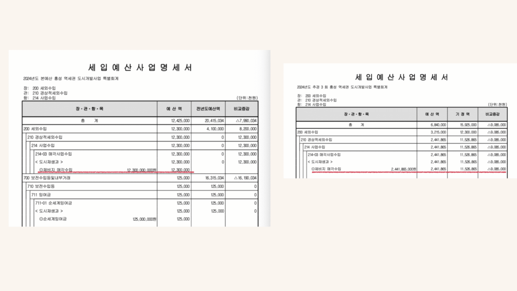 좀 더 자세히 전후 사정을 살펴보면, 이렇습니다. 홍성군은 2025년 연초에 역세권 부지를 매각해서 총 123억원의 수입을 확보하겠다고 계획한 바 있습니다. 그런데 실제 사업을 추진하다보니 역세권 부지매각이 제대로 이뤄지지 않아 90억 규모의 부지를 매각하지 못한 것입니다. 역세권을 신나게 개발했지만, 경기침체 등을 이유로 예상했던 만큼 매각을 하지 못해 세입 결손이 발생한 것으로 보입니다. 결과적으로 역세권 개발사업이 중장기적 사회 변화를 고려하지 못한 무리한 사업 추진이 된 것입니다. 부지조성은 완료되었지만, 여전히 텅비어있는 상황, 애꿎은 가로등만 켜져 있는게 현실입니다.
